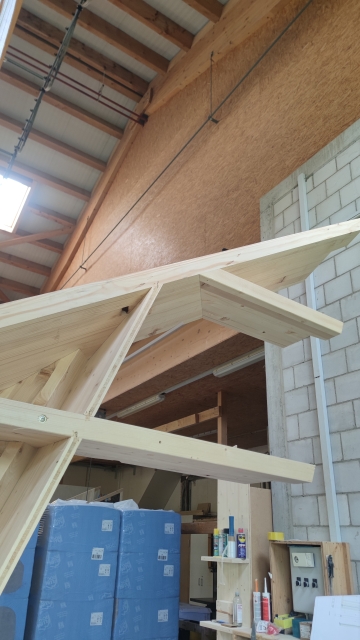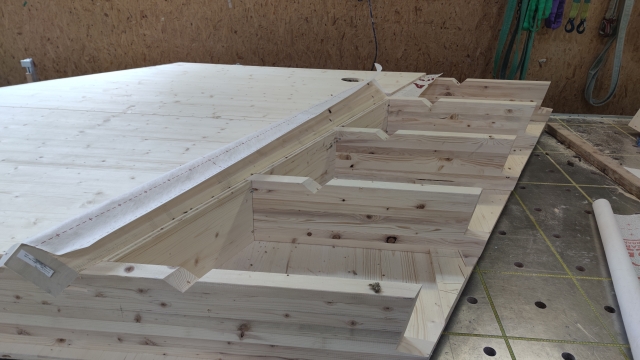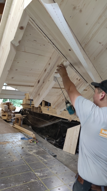 Dabei wird auf Holzbau gesetzt. Die gesamte Konstruktion und die Innenverkleidung besteht aus Holz aus der Region. Der Abbund ist erfolgt, die Wände sind produziert. Nun sind noch die schiefwinkligen und aufwändigen Dachelemente für das spezielle Walmdach mit auf dem sechseckigen Grundriss in Arbeit.