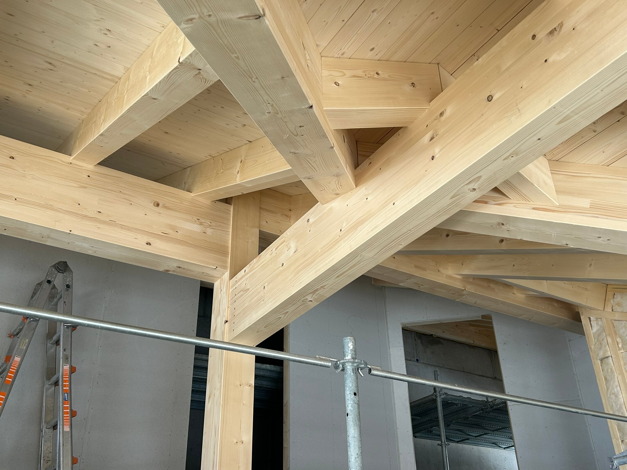 Nach intensiven Vorbereitungsarbeiten wurde das gesamte Mehrfamilienhaus in nur vier Tagen aufgerichtet. In dieser kurzen Zeitspanne entstanden zwei Geschosse mit Aussen- und Innenwänden. Zusätzlich wurde die gesamte Dachkonstruktion inklusive zweier Dachgiebel realisiert sowie die Dachschalung und die Dampfbremsfolie fachgerecht montiert.